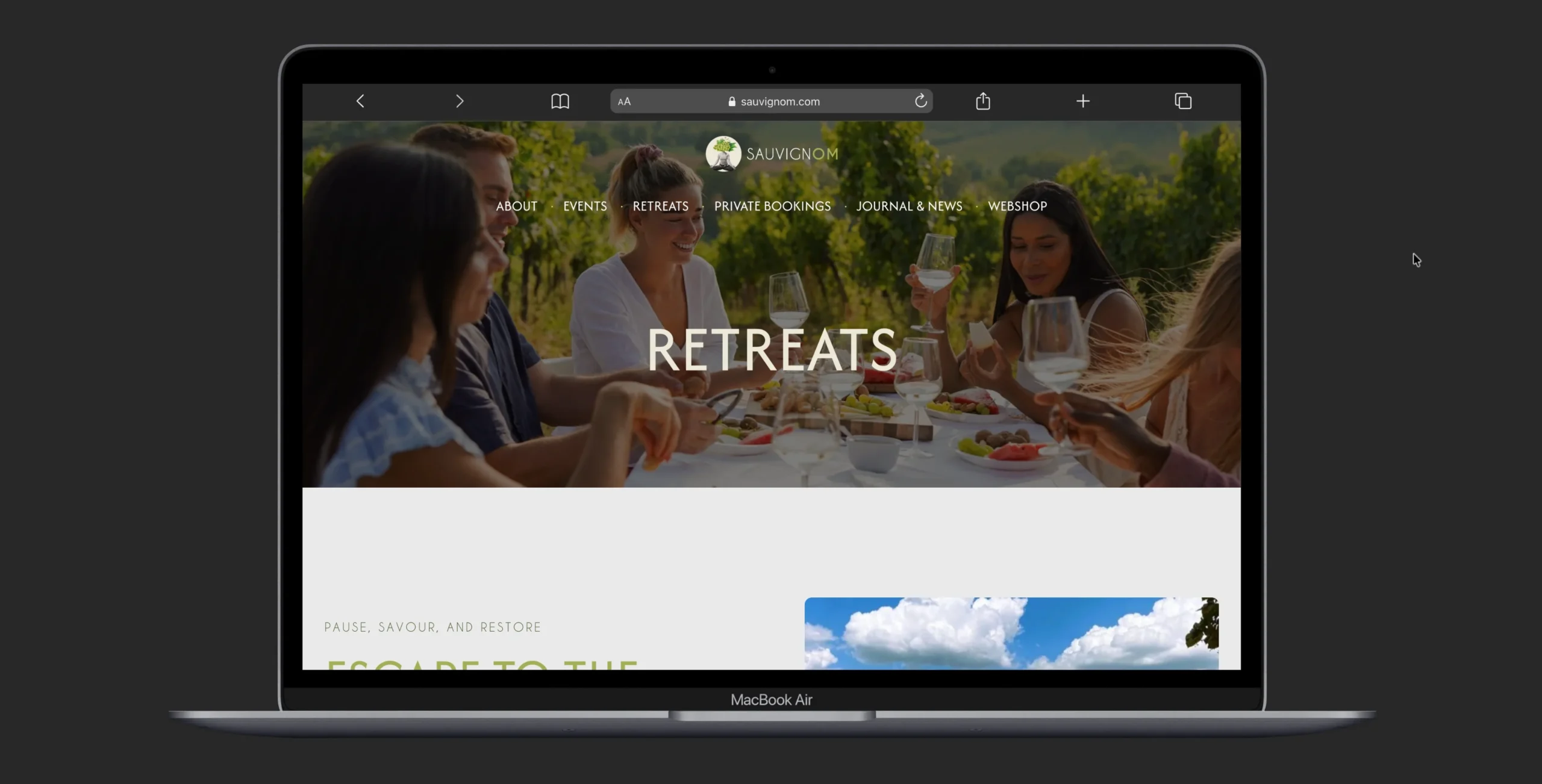 Hero forti, immagini evocative, spazi ampi e micro-copy orientati alla calma (“time to wine down”), per trasmettere subito il posizionamento.